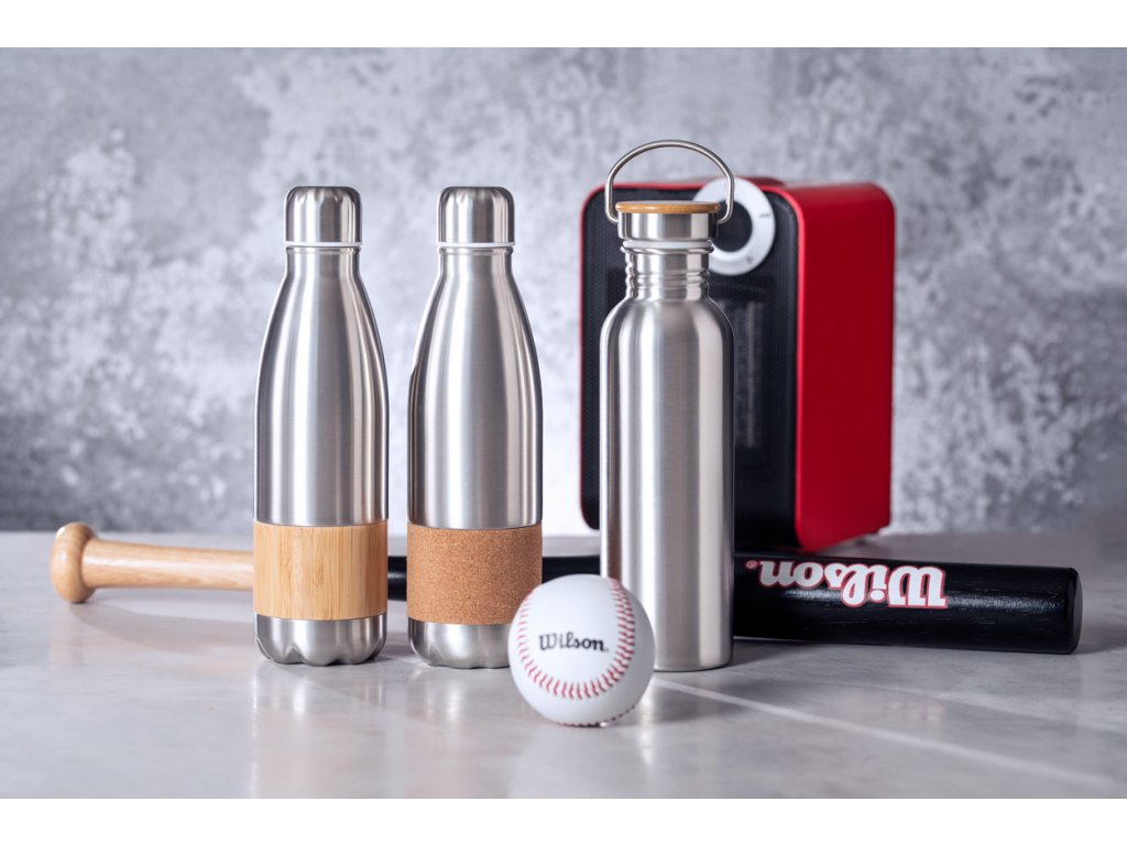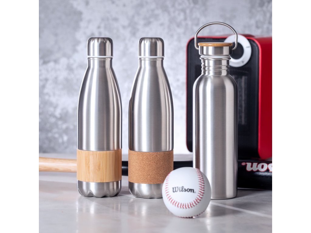 Nerezová sportovní láhev s přírodním korkem, 750 ml. Nevhodné pro sycené nápoje.