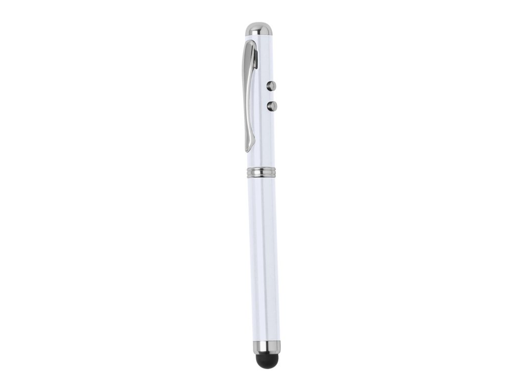 Multifunkční laserové ukazovátko s kuličkovým a dotykovým perem a LED světlem. Dodáváno s knoflíkovými bateriemi, kovovou dárkovou krabičkou a modrou náplní. ...