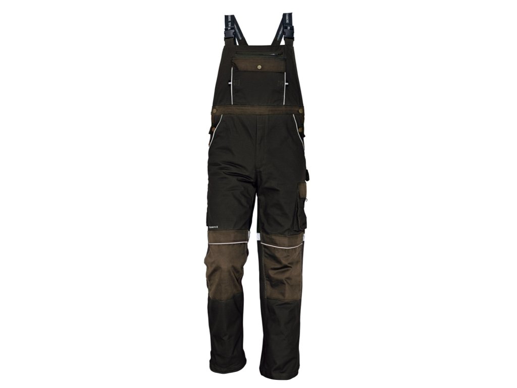 pracovní kalhoty s laclem vysoké odolnosti, elastický pas; kovové zipy a druky zapínání; 6 funkčních kapes; zesílená kolena s kapsami na vkládání nákoleníků; reflexní doplňky.