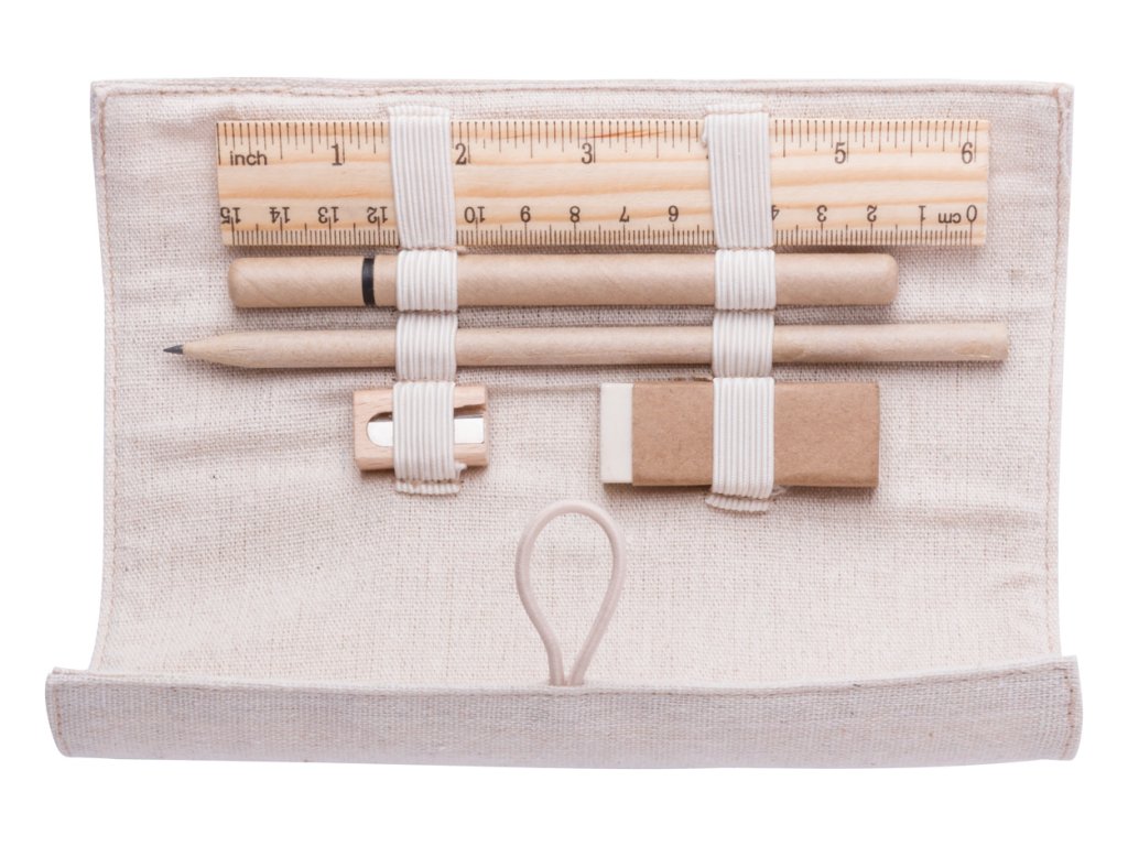 Jutové a bavlněné pouzdro na pera s knoflíkovým uzávěrem, včetně pera, tužky, pravítka, ořezávátka a gumy. ...