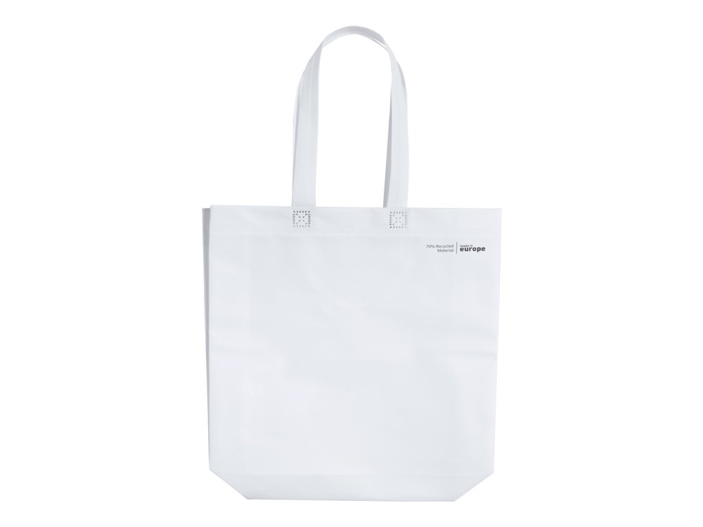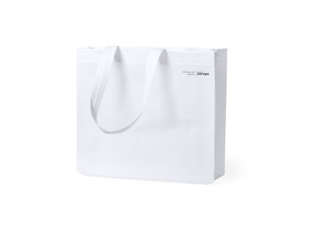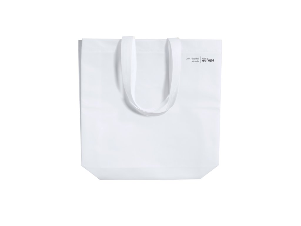 Nákupní taška z polaminované netkané textilie s klínem, dlouhými uchy a tepelně svařenými švy, 120 g/m². Vyrobeno ze 70 % z recyklovaného materiálu.