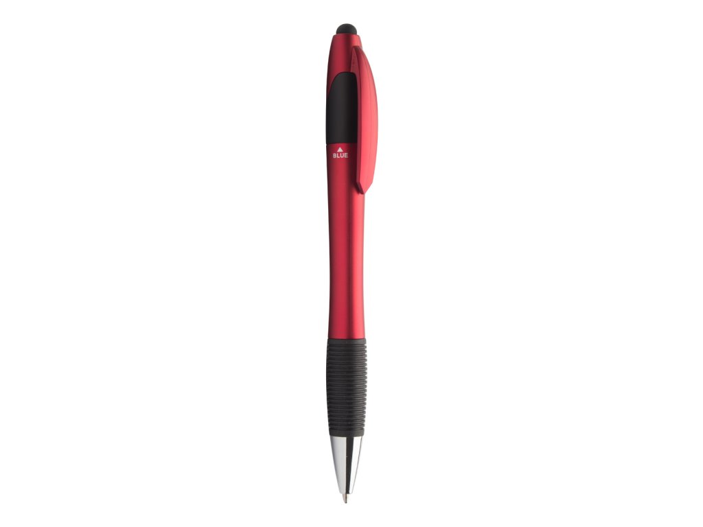 Plastové kuličkové a dotykové pero s gumovým úchopem, chromovou špičkou a metalickým povrchem. Se 3 barevnými náplněmi: černá, modrá a červená.