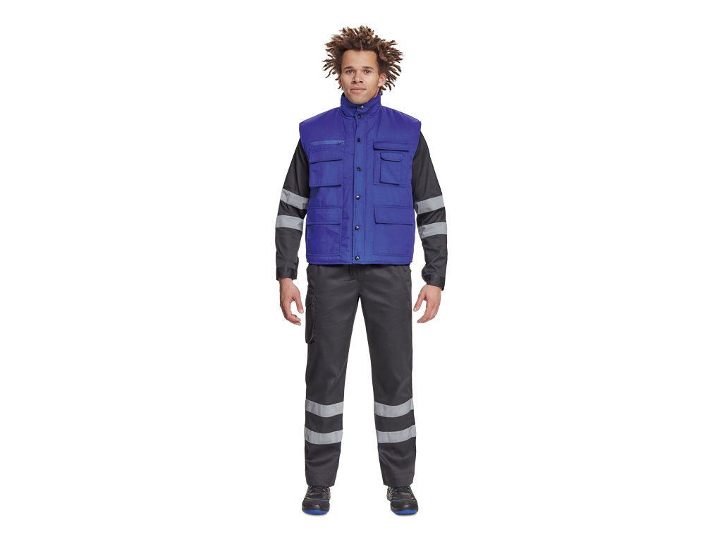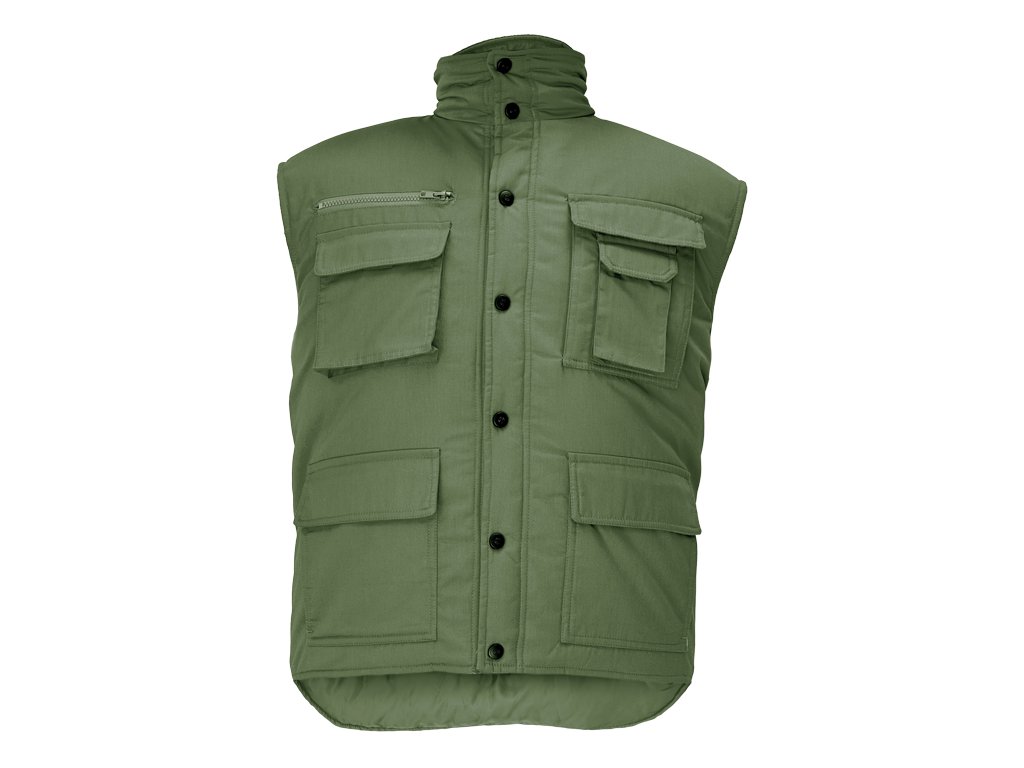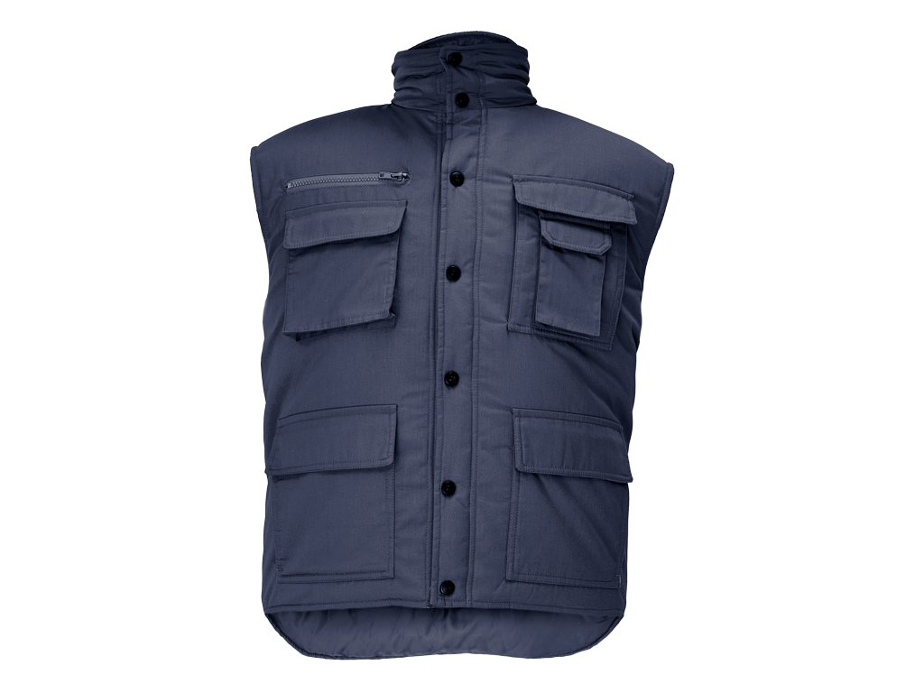 Zateplená pánská zimní vesta se stojáčkem; prodloužený díl na zádech; zapínání na plastové druky; 2 velké přední multifunkční kapsy; 2 náprsní mutlifunkční kapsy.