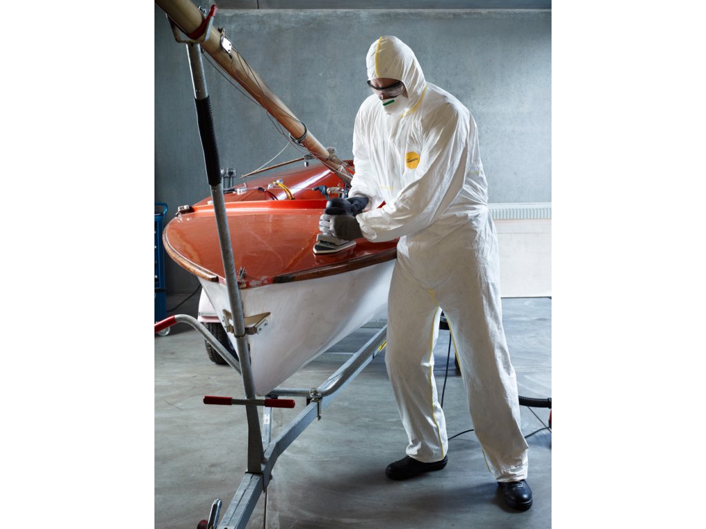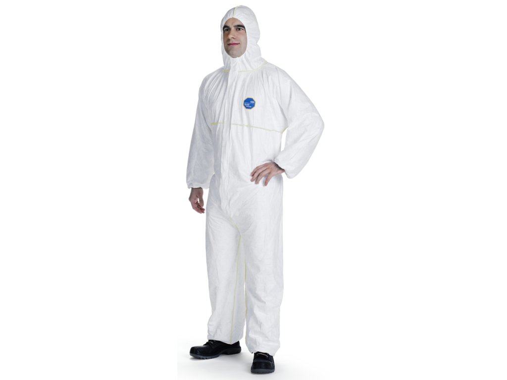 Tyvek 200 Easysafe bílý, větraný, antistatický ochranný overal s kapucí * chrání před prachem a radioaktivními částicemi, stejně jako před stříkajícími anorganickými chemikáliemi na vodní bázi * krytý zip, pogumované zápěstí, pas a kotníky, pogumovaná kapuce, zvenku prošitý žlutý bezpečnostní šev * III. kategorie ochrany, typ 5 a 6